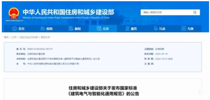 现批准《建筑电气与智能化通用规范》为国家标准,编号为GB 55024-2022,自2022年10月1日起实施。本规范为强制性工程建设规范,全部条文必须严格执行。现行工程建设标准中有关规定与本规范不一致的,以本规范的规定为准。同时废止下列工程建设标准相关强制性条文: